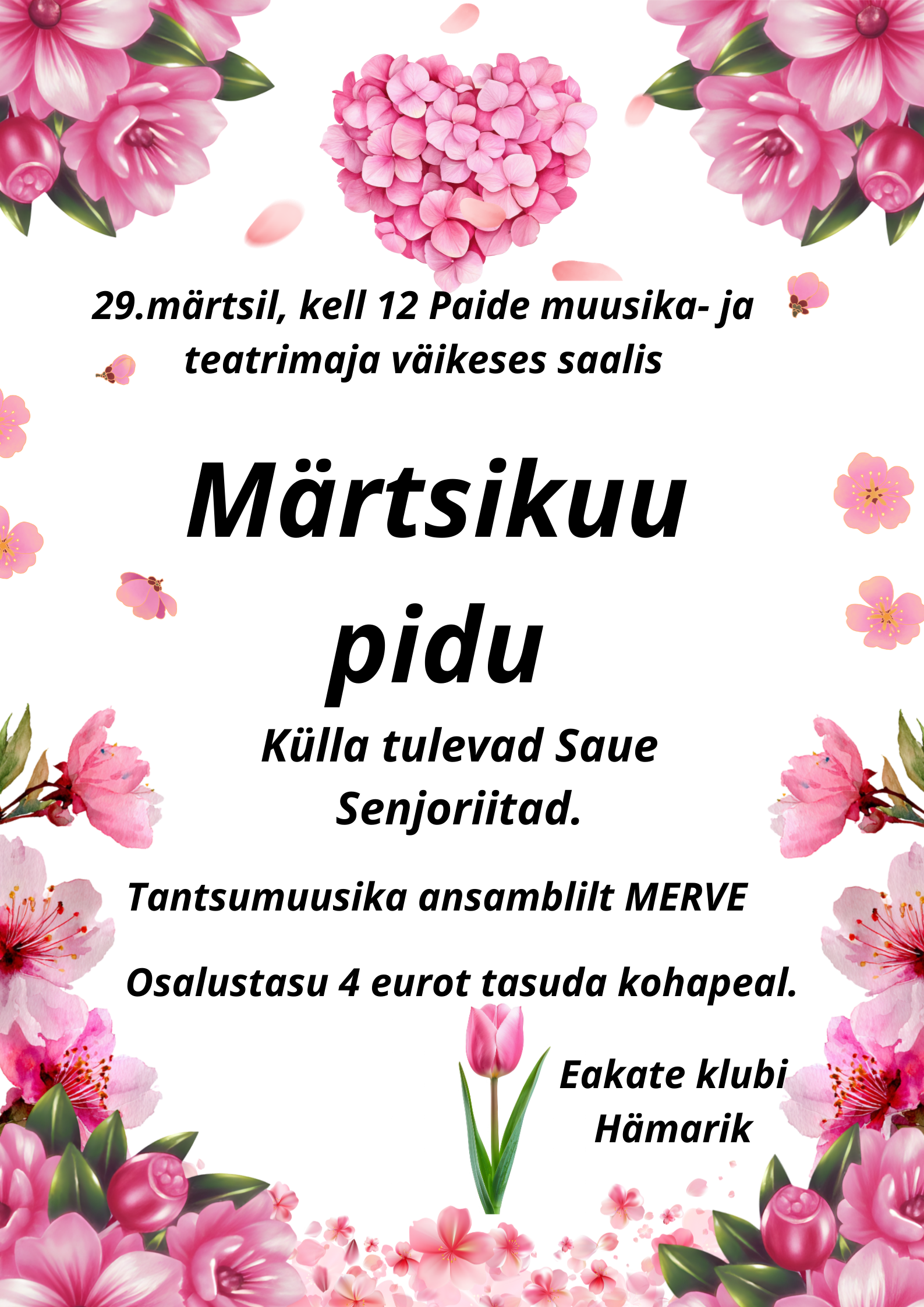 Pidu toimub 29.03.2026 kell 12:00 Paide Muusika- ja Teatrimaja väikeses saalis.