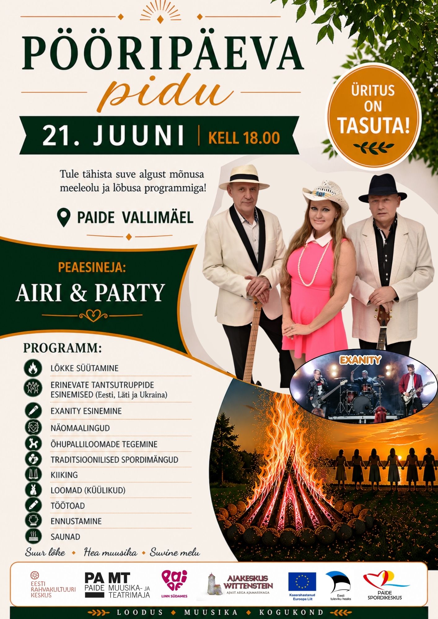 – süüdatakse suur jaanilõke, lavale astuvad tantsutrupid Eestist, Lätist ja Ukrainast ning muusikalise elamuse pakub ka ansambel Exanity.